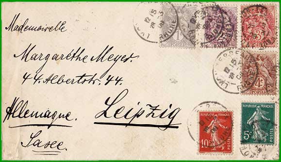 octobre 1907 Affranchissement à 25 c. Cette lettre, postée à Lyon le 28 mars 1908, est entrée en Allemagne le 29 mars 1908. |