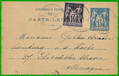 mai 1878 Affranchissement à 25 c. Cette carte-lettre à 15 centimes, postée à Montlignon le 10 août 1899 à destination de l'Allemagne, pesait moins de 15 grammes. L'expéditeur a donc ajouté un complément d'affranchissement de 10 centimes. |