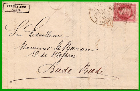 Affranchissement à 80 c.Cette lettre, postée à Paris le 29 juin 1872, pesait plus de 10 grammes. Elle a donc été affranchie à 80 centimes. C'est l'un des rares cas où le tarif unifié pour l'Allemagne représentait une augmentation par rapport au tarif à destination de l'ancien état indépendant (le grand-duché de Bade) qui aurait été de 50 centimes (jusqu'à 15 g.).