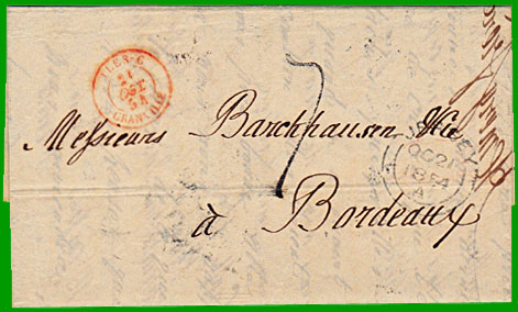 Elle est arrivée le 24 octobre 1854 à Bordeaux, où le destinataire a payé la taxe de 7 décimes.