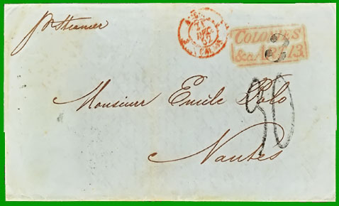 août 1849 Taxe 3,00 Francs Cette lettre, postée à St-Thomas, a été affranchie à 3 cents en numéraire pour le port intérieur (taxe tampon 3). Elle a transité par Londres le 20 décembre 1852 et elle est entrée en France le 21 décembre : cachet à date rouge " ANGL. CALAIS" et marque d'échange "COLONIES &c. ART. 13.". Elle est arrivée à Nantes le 22 décembre 1852 où le destinataire a payé la taxe de 30 décimes, matérialisée par le tampon 30. |