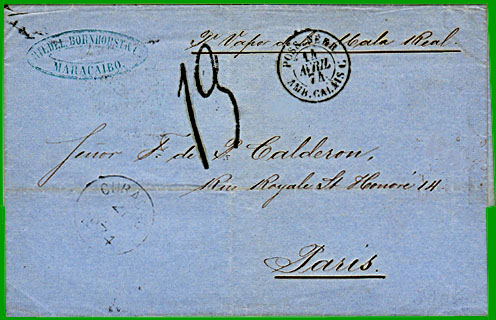 juillet 1871 Taxe 13 décimes Cette lettre non affranchie de Maracaibo (Venezuela), daté du 10 mars 1874, a été acheminée à Curaçao par "Vapor de la Mala Real". Elle a été postée le 21 mars au bureau de Curaçao. Elle a été acheminée via l'Angleterre jusqu'en France où elle est entrée le 14 avril : cachet à date "POSS. NEER. AMB. CALAIS C". Elle est arrivée le 14 mars à Paris, où le destinataire a dû payer la taxe de 13 décimes. |