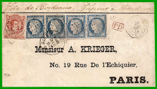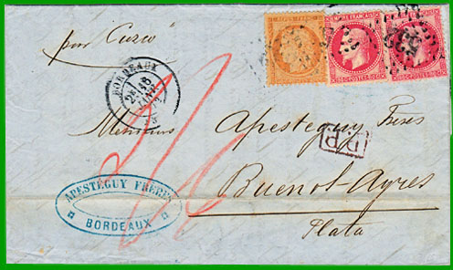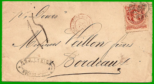 juillet 1871 par la voie de Lisbonne Affranchissement à 5 centavos + Taxe 1,50 francs Cette lettre, postée à Buenos-Ayres le 15 février 1875, a emprunté le paquebot anglais "Douro". Elle a débarqué à Lisbonne où elle a emprunté le train jusqu'à Bordeaux : cachet d'entrée rouge " OUTRE-MER AMB. IRUN A BORDX C" du 12 mars 1875 et taxe 15 décimes. |