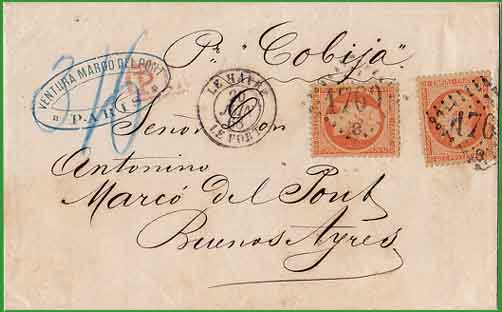 du 1er janvier 1866 (voie des bâtiments du commerce) Affranchissement français à 80 centimes + Taxe 3 pesos 6 reales Cette lettre a été postée au Havre le 20 juin 1868. Elle a été acheminée par le bâtiment du commerce "Cobija". Le tarif postal du 1er janvier 1866 était de 40 centimes par 10 grammes ou fraction. Affranchie à 80 centimes, elle pesait entre 10 et 20 grammes. La poste centrale de Buenos-Ayres a inscrit la taxe 3 pesos 6 reales au crayon bleu, correspondant à une lettre triple (8 à 12 adarmes), au tarif du 1er février 1865. Elle pesait donc entre 14,37 (8 adarmes) et 20 grammes. |