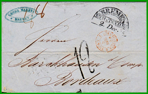 Taxe 2,50 francsCette lettre non affranchie, postée à Brême (Bremen) le 3 février, est entrée en France par Valenciennes le 6 février 1851 : cachet à date rouge "3 PRUSSE 3 VALENCIENNES". Elle est arrivée à Bordeaux, distante de 680 km en ligne droite, le 8 avril. La lettre pesant de 7,5 à 10 grammes, le destinataire a payé la taxe territoriale de 15 décimes, plus la taxe de transit prussienne de 10 décimes, soit 25 décimes.