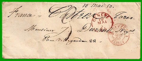 août 1849 avec le canton de Genève Taxe 30 centimes Cette lettre non affranchie, postée à Genève le 10 mai 1850, est entrée en France le 10 mai : cachet à date rouge " GENÈVE 1 FERNEY 1". Elle est arrivée le 14 mai 1850 à Castres-s-l'Agout, où le destinataire a payé la taxe de 3 décimes, matérialisée par le tampon 3. |