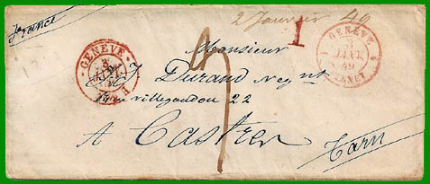 octobre 1845 avec le canton de Genève Taxe à 80 c. + 10 c. = 90 c. Cette lettre, postée à Genève le 3 janvier 1849, est entrée en France le même jour : " GENÈVE 1 FERNEY 1". Elle est arrivée le 5 janvier 1849 à Castres-s-l'Agout, distante de 420 km de Ferney. Le destinataire a donc payé la taxe territoriale de 8 décimes, plus la taxe genevoise de 1 décime, soit 9 décimes. |