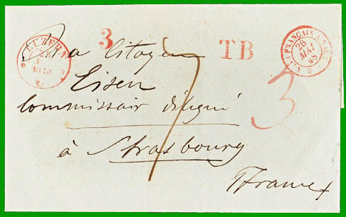 octobre 1845 avec le canton de Lucerne Affranchissement à 40 c. + 30 c. Cette lettre, postée à Lucerne le 25 mai 1848, est entrée en France le 26 mai : cachet à date rouge "Bau FRANÇAIS A BÂLE". Elle est arrivée le 26 mai 1848 à Strasbourg, distante de 112 km de St-Louis. Le destinataire a donc payé la taxe territoriale de 4 décimes, plus la taxe de Lucerne de 3 décimes (frappée au tampon rouge et manuscrite), soit 7 décimes. |