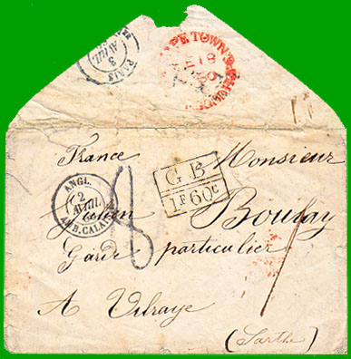 *Les lettres en provenance de France étaient affranchies seulement jusqu'à l'entrée à Cape Town (PP). Au-delà, elles étaient taxées par la poste du Cap de Bonne Espérance. L'affranchissement était obligatoire. |
