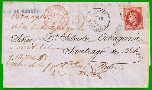 1853 Cette lettre, postée à Paris le 15 août 1870, a transité par Londres le 16 août. Elle a emprunté un bâtiment du commerce anglais reliant l'Angleterre à Valparaiso par le détroit de Magellan (Voir le chapitre "Voie d'Angleterre"). Comme elle pesait moins de 5 adarmes, elle a été taxée 15 centavos par la poste chilienne pour le port intérieur (taxe 15 au tampon rouge). |
