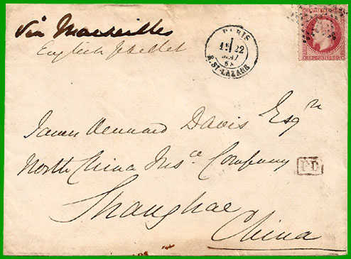 janvier 1866 Affranchissement à 80 c. Cette lettre, postée à Paris le 22 mai 1868, a embarqué à Marseille sur un paquebot anglais à destination d'Alexandrie ; ensuite elle a transité par le train spécial égyptien jusqu'à Suez où elle a embarqué pour Shang-Hai via Hong-Kong. Elle est arrivée au bureau français de Shang-Hai le 4 juillet 1868. |