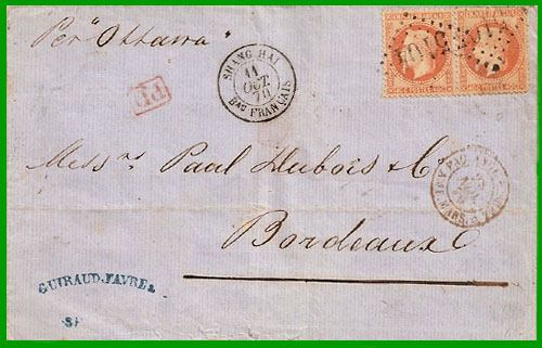 janvier 1866 Affranchissement à 80 c. Cette lettre, postée au bureau français de Shang-Hai le 11 octobre 1870, a emprunté le paquebot anglais "Ottawa". Elle a transité par le canal de Suez, et elle est arrivée à Marseille le 25 novembre : cachet à date rouge " PAQ. ANGL. V. SUEZ AMB. MARS *". Elle est arrivée à Bordeaux le 28 novembre 1870. |