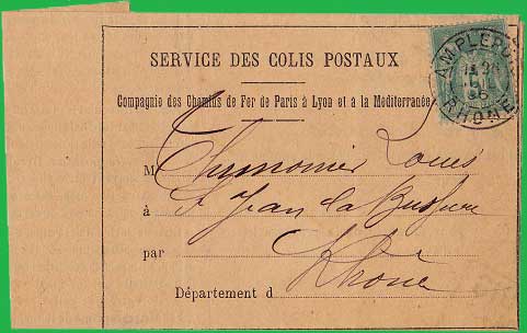 mai 1881 Affranchissement à 5 c. Cet avis de la Compagnie des Chemin de Fer de Paris à Lyon et à la Méditerranée, du 26 juillet 1896, invite M Thimonier Louis à venir retirer un colis postal, en gare d'Amplepuis. |