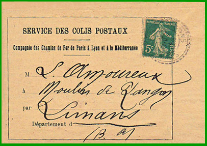septembre 1881 Affranchissement à 5 c. Cet avis de la Compagnie des Chemin de Fer de Paris à Lyon et à la Méditerranée, du 22 décembre 1917, invite M Lamoureux à venir retirer un colis postal, en gare de Forcalquier, contre remboursement de la somme de 40 F. |
