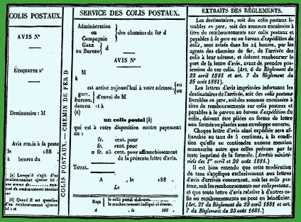 EXPÉDITION DES COLIS POSTAUX CONTRE REMBOURSEMENT. § 3. L'expéditeur d'un colis postal pourra demander que ce colis soit livré au destinataire contre un remboursement dont le maximum est fixé à 100 francs. Il devra faire mention de sa demande et du montant du remboursement, tant sur le bulletin d'expédition que sur l'adresse du colis et indiquer, en outre, s'il désire être payé soit à la gare ou au bureau d'expédition du colis, soit à domicile. Toutefois, le payement à domicile ne pourra, être demandé que dans le cas où l'expéditeur habite une localité desservie par un service de factage ou de correspondance rattaché à la gare de départ. TARIF. § 4. La taxe à payer pour l'encaissement et la transmission de toute somme perçue à titre de remboursement sur un colis postal est fixée, savoir : A 60 centimes (y compris le droit de timbre de 10 centimes) lorsque le payement de cette somme à l'expéditeur devra avoir lieu à la gare ou au bureau d'expédition du colis ; A 85 centimes (y compris le droit de timbre de 10 centimes) lorsque l'expéditeur demandera que ladite somme lui soit payée à domicile. § 5. Cette taxe sera toujours acquittée au départ en même temps que les frais de transport du colis postal. A cet effet, l'expéditeur devra remettre à la gare ou au bureau du départ deux bulletins d'expédition des modèles n° 3 et 3 bis annexés au règlement du 22 avril 1881 et du prix de 60 ou de 85 centimes, selon le cas. L'un de ces bulletins dûment rempli, daté et signe par l'envoyeur, devra accompagner le colis ; l'autre bulletin, destiné à assurer le retour de la somme à encaisser, sera rempli par les agents du chemin de fer. TRANSPORT. § 6. La transmission aux ayants droit des sommes perçues à titre de remboursement sur les colis postaux s'effectuera dans les délais assignés aux transports en grande vitesse. PAYEMENT DU REMBOURSEMENT. § 7. Après encaissement, le montant du remboursement sur un colis postal est remis, soit à la gare ou au bureau d'expédition du colis, soit à domicile, au destinataire qui doit en donner décharge en toutes lettres au verso du bulletin ayant servi à la transmission du remboursement. § 8. Les destinataires des sommes payables en gare ou au bureau d'expédition du colis seront prévenus, dans les vingt-quatre heures par les agents du chemin de fer, de l'arrivée desdites sommes et devront rembourser le port de la lettre d'avis. § 9. Un arrêté ministériel en date du 20 août 1881 a fixé à 5 centimes le port des lettres d'avis que les chefs de gare expédieront ainsi par la poste, aux destinataires des sommes perçues à titre de remboursement sur colis postaux. Ces lettres d'avis devront être affranchies au départ en timbres-poste ; elles ne devront contenir aucune mention ou annotation manuscrite autres que celles prévues par le texte imprimé des formules, sous peine de refus de transmission ; elles devront être conformes au modèle figurant à la page 313 du Bulletin mensuel n° 36 supplémentaire et qui est reproduit ci-après avec les additions nécessitées par le nouveau service. L'attention des agents est tout particulièrement appelée sur ces dispositions qui s'appliquent aux seuls avis concernant les remboursements sur colis postaux, à l'exclusion des avis relatifs aux remboursements sur tout autre article de messagerie. § 10. Toute somme portée à domicile par un service de factage ou de correspondance et qui n'aura pu être remise au destinataire pour une cause quelconque, sera tenue en gare, à la disposition de l'ayant droit. Si un second transport à domicile est demandé par celui-ci, la livraison aura lieu contre un nouveau droit de 25 centimes. (Bulletin mensuel n° 40 supplémentaire, d'août 1881)