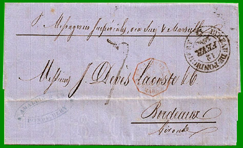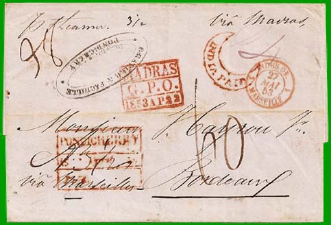 Affranchissement 3½ annas + Taxe 6 francsCette lettre pesant 38 g a été postée à Pondichéry le 19 avril 1853. L'expéditeur a acquitté en numéraire le port anglais jusqu'à Alexandrie, soit 3½ annas. Elle a transité par Madras où elle a embarqué sur le paquebot anglais "Singapore" le 22 avril. Elle est arrivée à Suez le 17 mai, puis à Alexandrie le 19 mai. Elle a embarqué sur le paquebot français "Nil" le 20 mai, et elle est arrivée à Marseille le 27 mai : cachet à date rouge "