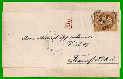 juillet 1858 (Prusse) Affranchissement à 10 c. Cet imprimé a été posté au bureau de poste de Paris St-Lazare le 23 mars 1868. Il est arrivé à Frankfurt-am-Main le 24 mars 1868. |