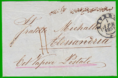 avril 1851 Affranchissement à 2 crazie + Taxe 11 décimes Cette lettre, postée à Livorno (Livourne) le 1 avril 1851, a été affranchie 2 crazie pour le port intérieur toscan : inscription manuscrite 10 (quattrini) au verso. Elle a été acheminée à Alexandrie par "Vapore Postale" français. Elle est arrivée le 18 avril 1851 à Alexandrie, où le destinataire a payé la taxe française de 11 décimes. |