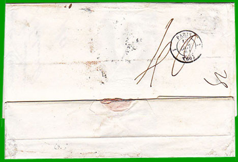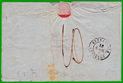 Jusqu'au 30 septembre 1853, il est impossible d'envoyer une lettre affranchie jusqu'à destination par la voie de terre. Lorsque le port local est payé en numéraire, le montant est indiqué au verso. |