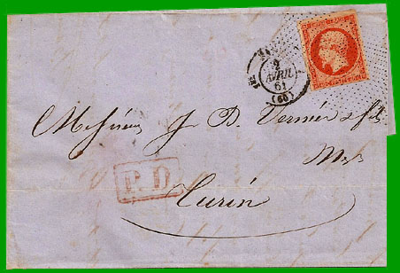 Affranchissement à 40 c.Cette lettre, postée à Paris le 2 avril 1861, est arrivée à Turin, capitale des États Sardes, le 3 avril 1861. Ce tarif postal préfigure le tarif du 1er octobre 1861 à destination du royaume d'Italie.