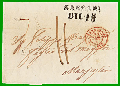 Taxe 1,10 francsCette lettre non affranchie, postée à Sassari le 15 décembre 1845, est entrée en France par Antibes le 22 décembre : cachet à date rouge "SARDAIGNE ANTIBES". Elle est arrivée à Marseille, distante de 145 km en ligne droite, le 23 décembre. Le destinataire a payé la taxe territoriale de 4 décimes, plus le port sarde de 7 décimes (inscrit en violet sur la lettre), soit 11 décimes.