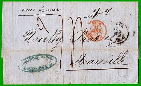Taxe 1,40 FCette lettre non affranchie, postée à Genova (Gènes) le 10 mars 1860, a été acheminée par paquebot jusqu'à Marseille : mention manuscrite "voie de mer" en haut à gauche de la lettre. Elle est entrée en France le 11 janvier : cachet à date rouge "SARD. MARSEILLE". Cette lette pesant plus de 7,5 grammes (mention manuscrite "2"), le destinataire a payé la taxe de 14 décimes