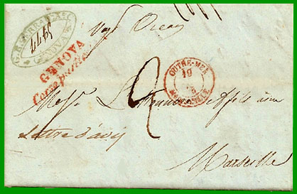 Taxe 20 centimesCette lettre non affranchie, postée à Genova (Gènes) le 18 avril 1848, a emprunté le bâtiment du commerce "Océan". Elle est entrée en France par Marseille le 19 avril : cachet à date rouge "OUTRE-MER MARSEILLE". Le destinataire a payé la taxe locale de 1 décimes, plus la taxe de voie de mer de 1 décimes, soit 2 décimes.