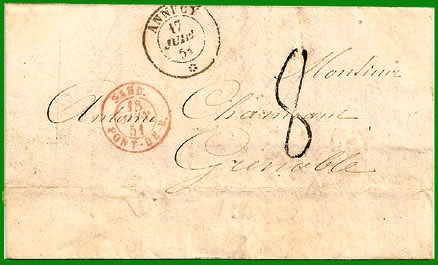 Taxe 80 centimesCette lettre non affranchie, postée à Annecy (Savoie) le 17 juin 1851, est entrée en France le 18 juin par la voie de terre : cachet à date rouge "