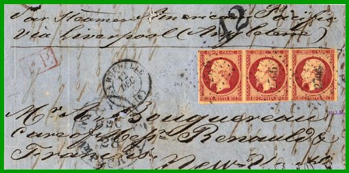 juillet 1851 LETTRE 2ème ÉCHELON (de 1/2 à 1 oz) Affranchissement à 2,40 F + Taxe 42 cents Cette lettre, postée à La Rochelle le 12 décembre 1855, a embarqué à Liverpool sur le paquebot américain "Pacific" de la "Collins Line". Elle est arrivée le 28 décembre 1855 à New-York (cachet "NEW. YORK. AM PACKET"), où le tampon taxe 42 (cents) a été apposé par la poste américaine. |