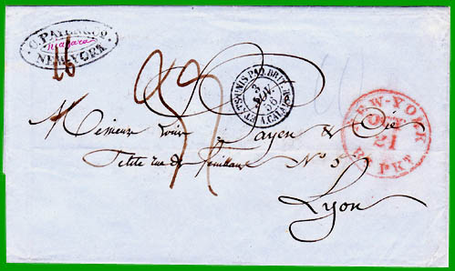 juillet 1851 Affranchissement à 10 cents + Taxe 3,90 F Cette lettre a été postée à New-York le 21 octobre 1856, et l'expéditeur a payé le port américain de 10 cents (1/2 à 1 once), matérialisé par la marque manuscrite "10" au crayon gris. Elle a été acheminée jusqu'à Liverpool par le paquebot anglais "Niagara". Elle est entrée en France le 3 novembre 1856 : cachet à date noir "ETATS-UNIS PAQ. BRIT. A. CALAIS M".Elle est arrivée le 5 novembre 1856 à Lyon, où le destinataire a payé la taxe de 39 décimes (lettre de 16 grammes) (tarif du 1er décembre 1851). |