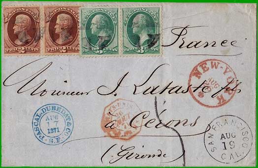 juillet 1871 par la voie française Affranchissement à 10 cents + Taxe 50 centimes Cette lettre, postée à San Francisco le 19 août 1871, a été affranchie à 10 cents. Elle a transité par New-York le 26 août et elle a emprunté le paquebot français "Péreire" de la ligne H, cachet à date rouge : " ETATS-UNIS PAQ. FR. H N°1". Elle a été taxée 5 décimes à l'entrée en France. |
