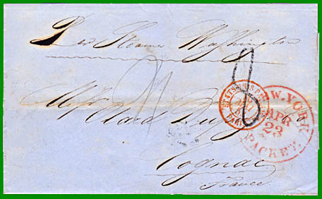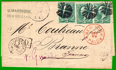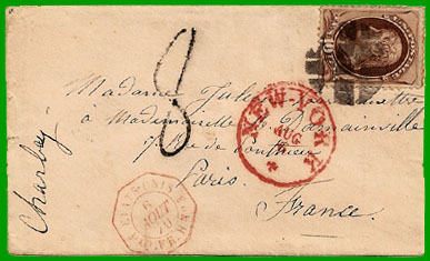 La convention de poste du 3 mars 1857 entre les Etats-Unis et la France permet aux envoyeurs d'expédier leurs lettres affranchies jusqu'à destination, ou non affranchies. |