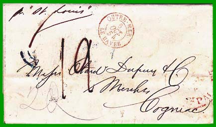 juillet 1851 LETTRE 1er ÉCHELON AMERICAIN (jusqu'à 1/2 once) et 2ème ÉCHELON FRANCAIS Affranchissement à 20 cents + Taxe 1,20 F Cette lettre, postée à New-York le 22 septembre 1854, a été affranchie à 20 cents en numéraire par l'expéditeur (chiffre "20" manuscrit, en bas à gauche de la lettre). Elle a été acheminée par le paquebot américain "St-Louis", et elle est entrée en France par Le Havre, le 6 octobre : cachet à date rouge " OUTRE-MER LE HAVRE". Elle est arrivée le 8 octobre 1854 à Cognac, où le destinataire a payé la taxe de 12 décimes, pour une lettre pesant entre 7,5 et 14,17 grammes (tarif du 1er octobre 1850). |