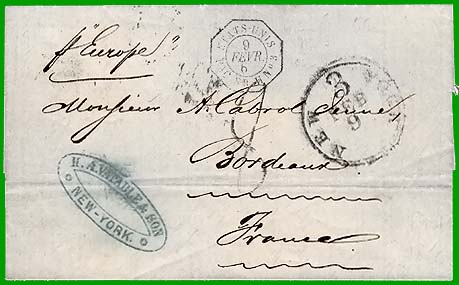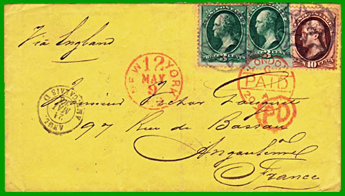 La convention de poste du 3 mars 1857 entre les États-Unis et la France expire le 31 décembre 1869 sans être renouvelée. Par la voie française, les lettres doivent donc être affranchies jusqu'au port de débarquement du Havre (PP) et sont taxées par la poste française. Par contre il y a toujours une convention postale entre l'Angleterre et les États-Unis. Par la voie d'Angleterre, les lettres peuvent donc être :