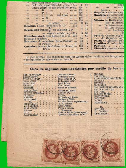 | Tarif du 1er avril 1856 (voie d'Espagne, sortie frontière française) | 40 g. | 5 c. | 40 g. | 5 c. |