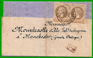 A partir du 1er janvier 1860, jusqu'au 15 juillet 1869, application d'une taxe fixe de 5 centimes à l'entrée en France, sur les imprimés et journaux correctement affranchies. |