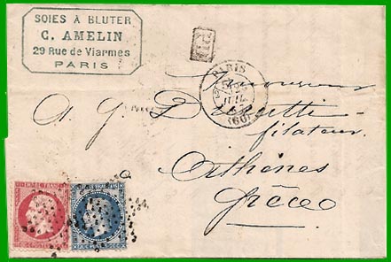 Affranchissement à 1,00 FCette lettre a été postée à Paris le 25 juillet 1867. Bien qu'affranchie au tarif des paquebots français, elle a transité par le port autrichien de Trieste le 28 juillet. Elle est arrivée à Athènes le 27 (calendrier julien).