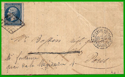 § 17. À la réception desdites lettres, le timbre à date du bureau étranger dont elles sont frappées est barré en croix et remplacé par le timbre du bureau ambulant de Genève à Mâcon, ou par celui du bureau ambulant de Marseille à Lyon, suivant le point de leur entrée en France. De plus, celles qui sont affranchies au moyen de timbres-poste sardes reçoivent l'empreinte du timbre P. P. à côté du timbre-poste