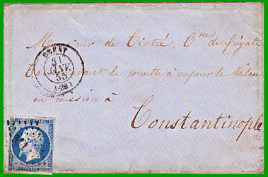 Affranchissement à 20 c.Cette lettre a été postée à Brest le 31 janvier 1855 à destination du Commandant la corvette à vapeur le "Milan" à Constantinople.