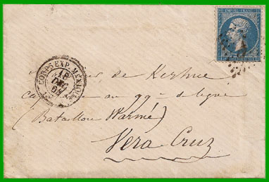 Cachet "CORPS EXP. MEXIQUE" du 18 décembre 1864 sur une lettre d'un militaire stationné à Mexico à destination d'un Capitaine du 99ème de ligne à Vera-Cruz (le courrier militaire à l'intérieur du Mexique n'est pas courant).