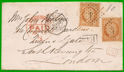 janvier 1866 Affranchissement à 80 c. Cette lettre, postée à Paris le 15 janvier 1869, a transité par Londres le 19 janvier. |