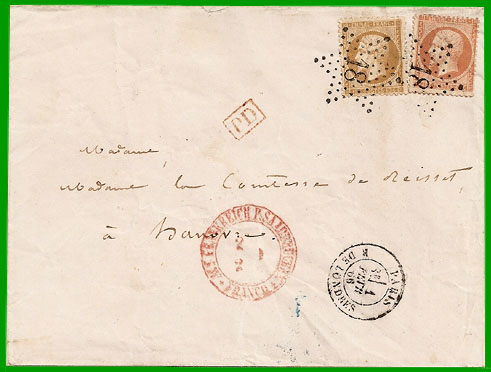 Affranchissement à 50 c.Cette lettre, postée à Paris le 1er février 1866, a transité par Saarbrücken (en Prusse) le 2 février. Elle est arrivée à Hanovre, le 2 février.