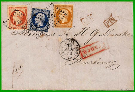 Affranchissement à 70 c.Cette lettre, postée à Paris DS3 le 16 janvier 1856, a transité par la Prusse le 17 janvier. Elle est arrivée à Harbourg, le 18 janvier.
