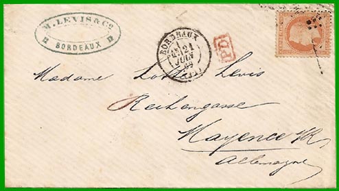 Affranchissement à 40 c.Cette lettre, postée à Bordeaux le 21 juin 1869, est arrivée à Mainz (Mayence) le 23 juin 1869.