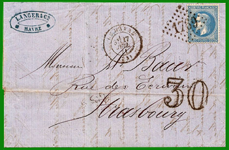 Lettre postée le 17 juillet 1871 au Havre à destination de Strasbourg annexé, taxée 30 centimes. |