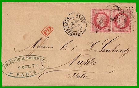 Affranchissement à 1,60 FCette lettre, postée à Paris le 8 octobre 1872, est arrivée à Naples le 10 octobre 1872.