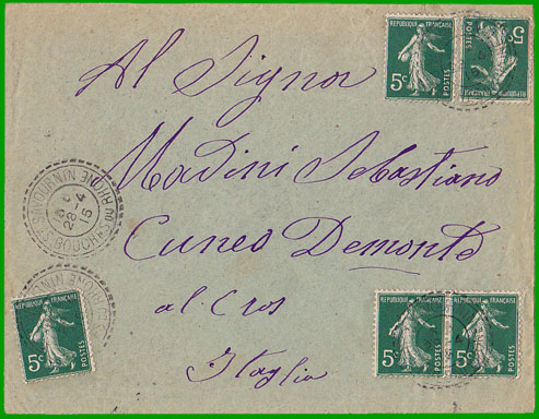 mai 1910 Affranchissement à 25 c. Cette lettre, postée à St-Savournin le 28 avril 1915, est arrivée le 2 mai 1915 à Demonte. |