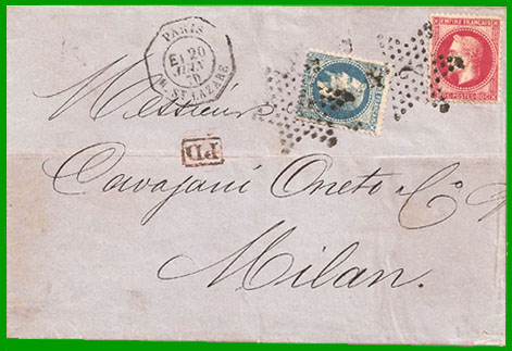 A dater du 1er octobre 1861, les dispositions de la Convention de Poste conclue entre la France et la Sardaigne, le 4 septembre 1860, concernant les correspondances originaires ou à destination des territoires directement desservis par les postes sardes, seront applicables aux correspondances provenant ou à destination de la Sicile et des provinces de l'ancien royaume de Naples (Bulletin Mensuel n°73, circulaire n°221, de septembre 1861). Cette circulaire est le document fondateur des tarifs postaux avec le royaume d'Italie. La première convention de poste spécifique entre la France et l'Italie ne sera signée que le 3 mars 1869. Elle ne modifiera pas le tarif des lettres.