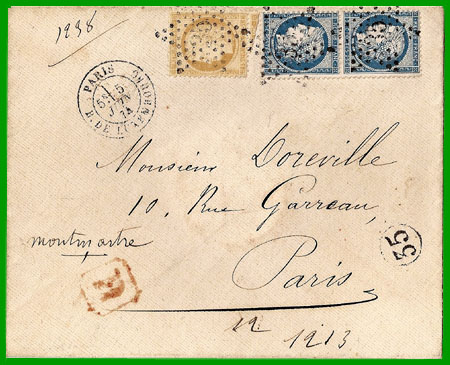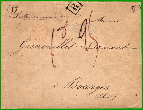 juillet 1850 Taxe 1,00 + 0,25 = 1,25 F Cette lettre recommandée, postée à Paris le 7 mai 1853 (cachet rouge " BEAU CENTRAL (60)"), a été expédiée non affranchie (l'usage du timbre-poste ne sera favorisé par le tarif qu'à partir du 1er juillet 1854). Elle est arrivée le 8 mai à Bourges, où le destinataire a payé l'affranchissement de 1,00 franc, correspondant à une lettre de 25 ½ grammes (indication manuscrite sur l'enveloppe) + la taxe fixe de 0,25 franc pour la recommandation, soit 1,25 F. |