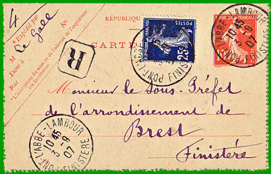 : 10 c. Cette carte-lettre a reçu un complément d'affranchissement de 25 centimes, pour être expédiée en recommandé. Elle a été postée le 3 septembre 1907 à Pont-L'Abbé-Lambour. |